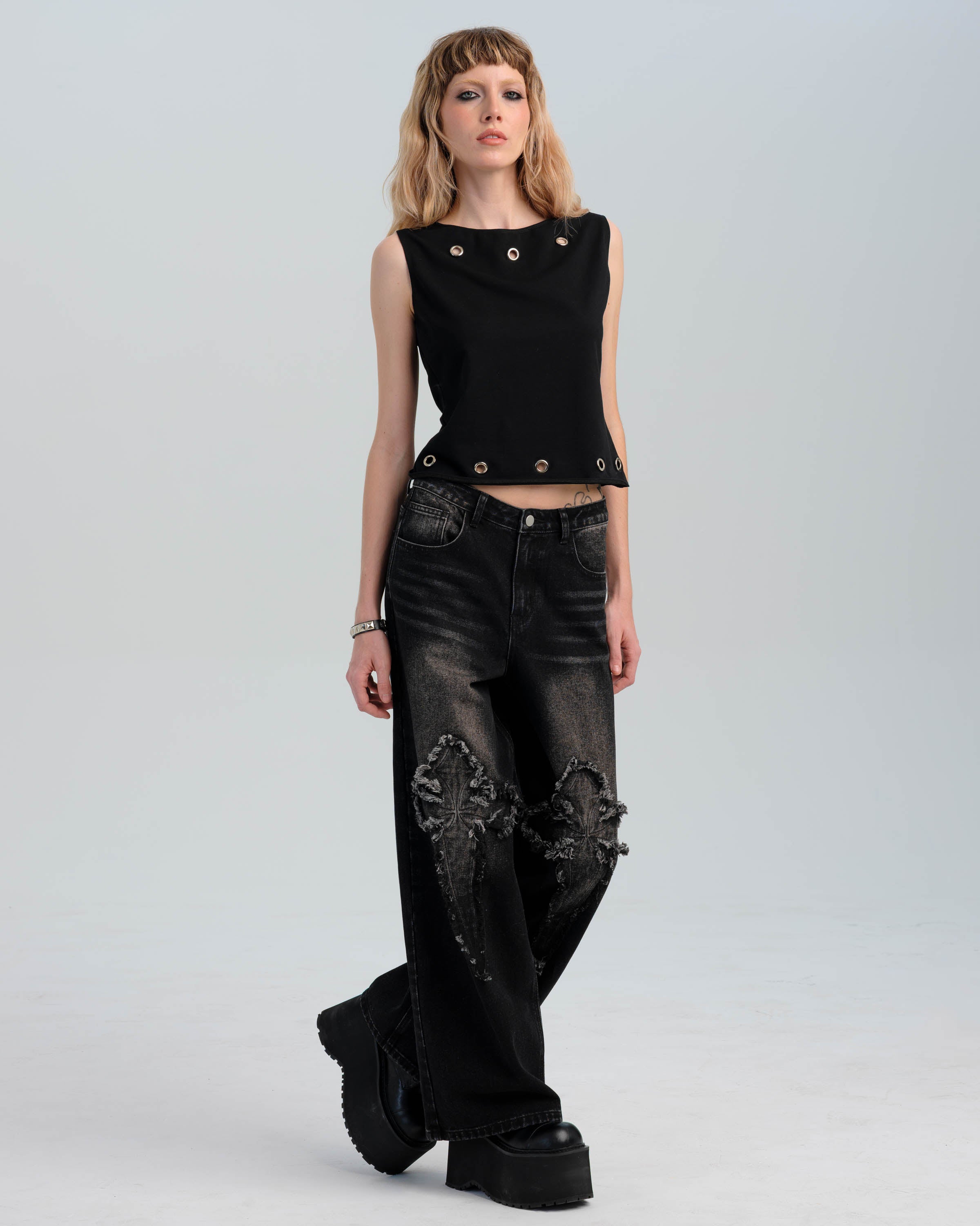 - Black washed denim construction