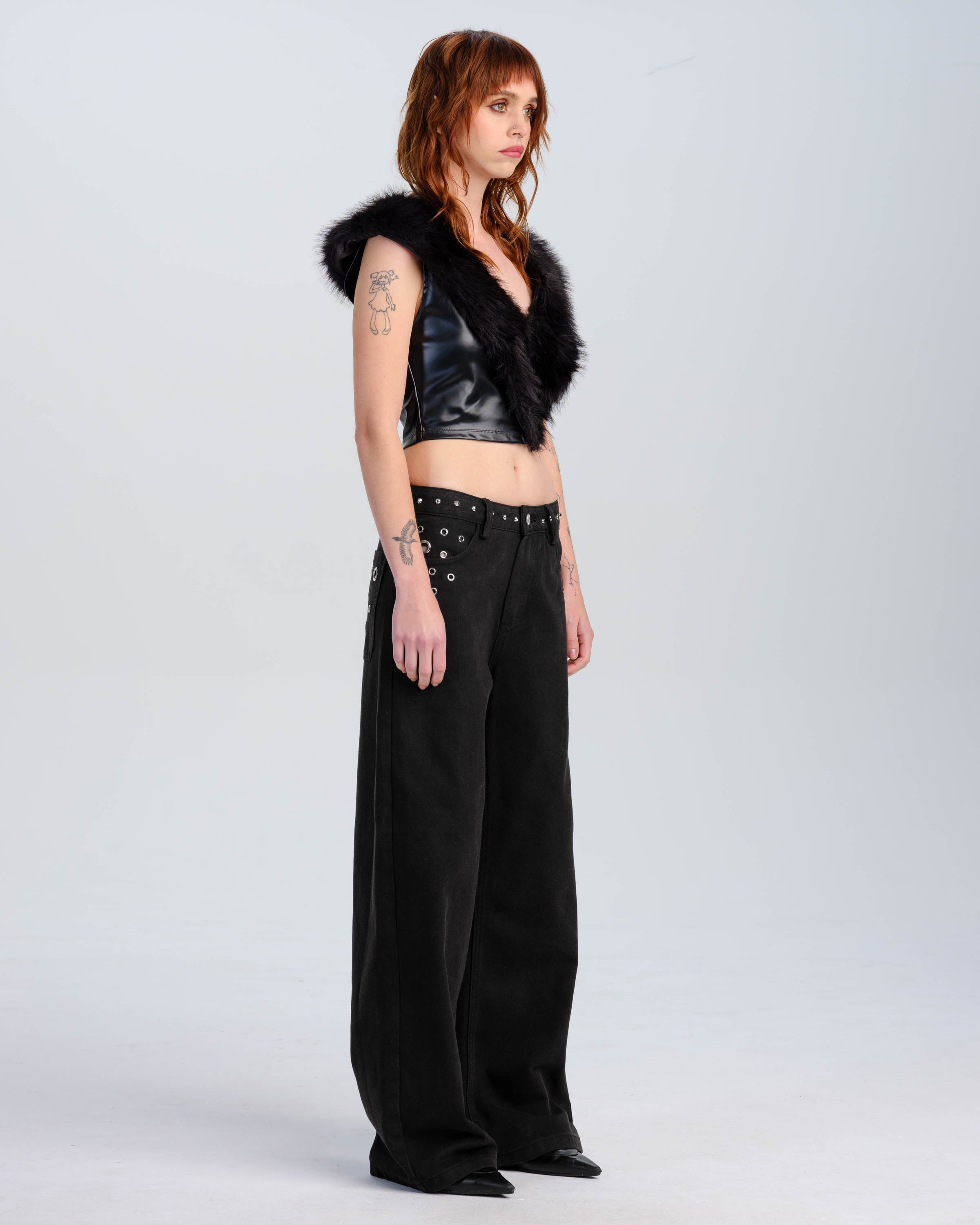 - Eyelet detailing around waistband and pockets